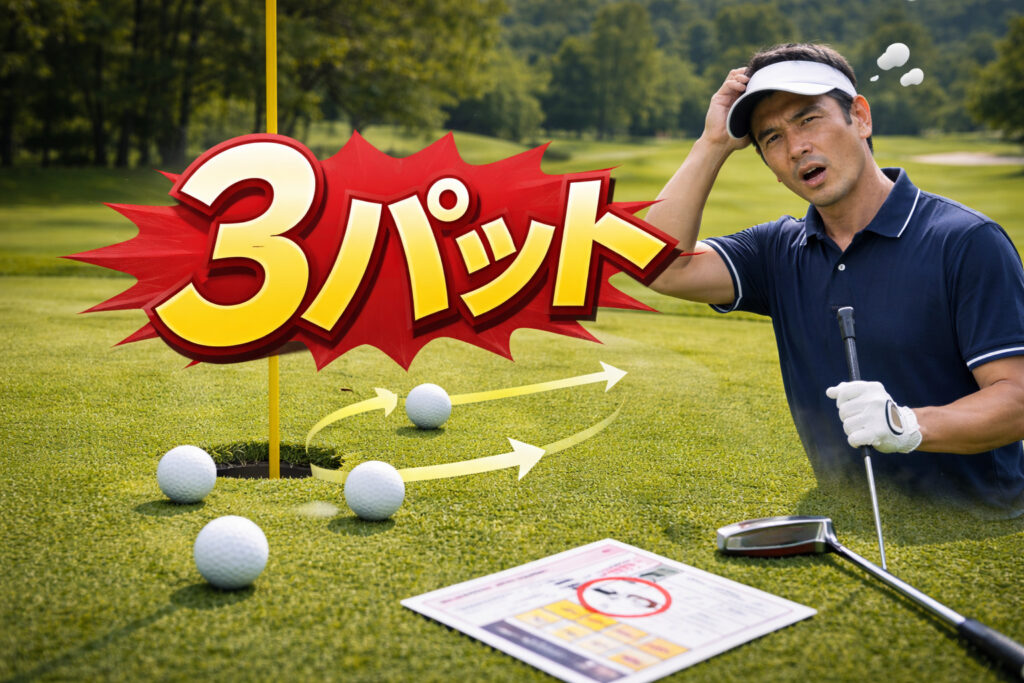 3パットって、短いパットを外すのが原因に見えがちですが、実は「ファーストパットが遠すぎる」ことが一番多いです。つまり、問題はグリーン上だけじゃなく、グリーンに乗せる場所や、アプローチの距離感にもつながっています。ピン横に乗せようとしてグリーンを外す→難しいアプローチ→結局ロングパット→3パット、みたいな連鎖が起きやすいです。