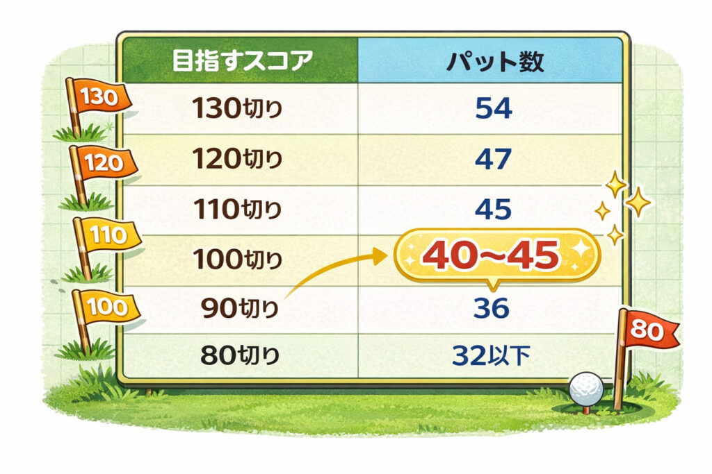 | 105〜110前後 | 40以内 | 3パットを減らす |