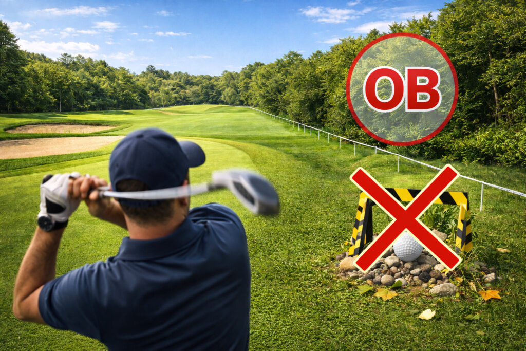 OBは、ルール上は「1打罰+打ち直し(ストロークと距離)」が基本です。つまり、ティーショットがOBなら、次は3打目を打つことになります。これを理解すると、ドライバーで無理するより、確実に前に運ぶ価値がよく分かるはずです。