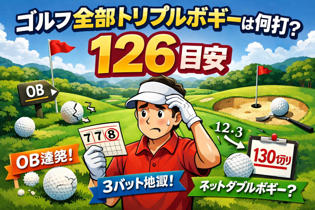 ゴルフで全部トリプルボギーって、結局何打になるの?ここ、気になりますよね。 パー72なら126ってよく聞くけど、計算のしかたが合ってるか不安だったり、トリプルボギーペースで130切りや120切りとどうつながるのかもモヤっとしがちです。 さらに、OBや紛... -